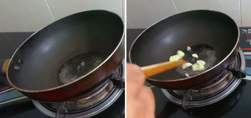 Làm nóng chảo, cho 1 muỗng cà phê dầu ăn vào, đợi dầu nóng thì cho tỏi đập dập vào phi vàng thơm.
