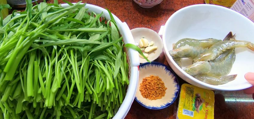 Khi nước sôi cho tôm và dầu tỏi vừa phi vào, nấu khoảng 3 phút thì cho rau muống vào, bật lửa lớn để nấu trong khoảng 30 giây và tắt bếp để rau muống giữ được màu xanh.